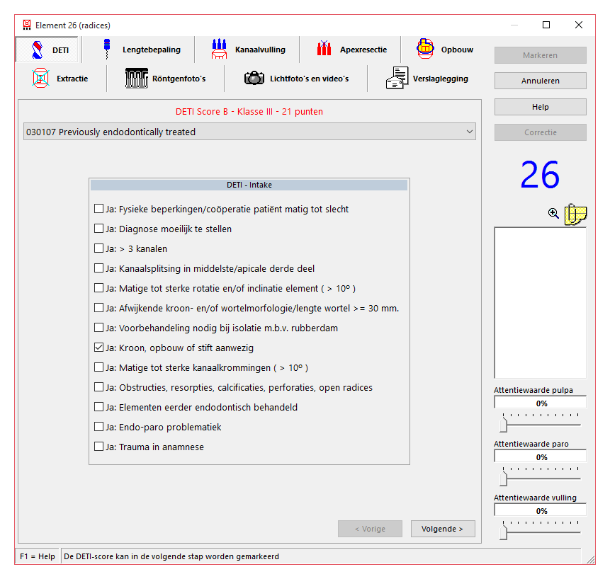 TabDents heeft de DETI score geïntegreerd. Een of meer tikken op ja en de classificatie kan worden bepaald en de endodontische behandeling uitgevoerd.